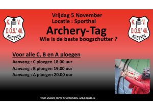 Op vrijdag 5 November organiseert de ACD Archery-Tag in de sporthal voor de C,B en A ploegen.